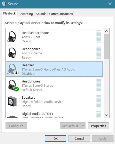 - Now disable all Bluetooth microphones you find here. To disable a device, click on it, then click “Properties” then in the “Device Usage” drop down menu, pick “Don’t use this device (disable)” and click Apply. For example, the highlighted “Headset – BTunes Senn/5” in the above screenshot was the supposed microphone input on my Bluetooth headphones, but the headphones have no microphone at all. On another PC, the device that needed to be disabled was named “Hands Free AG Audio.” Disable all Bluetooth related microphones and inputs here in the “Recording” tab. While you’re at it, you can disable any other sound inputs that you will never use that are listed here.